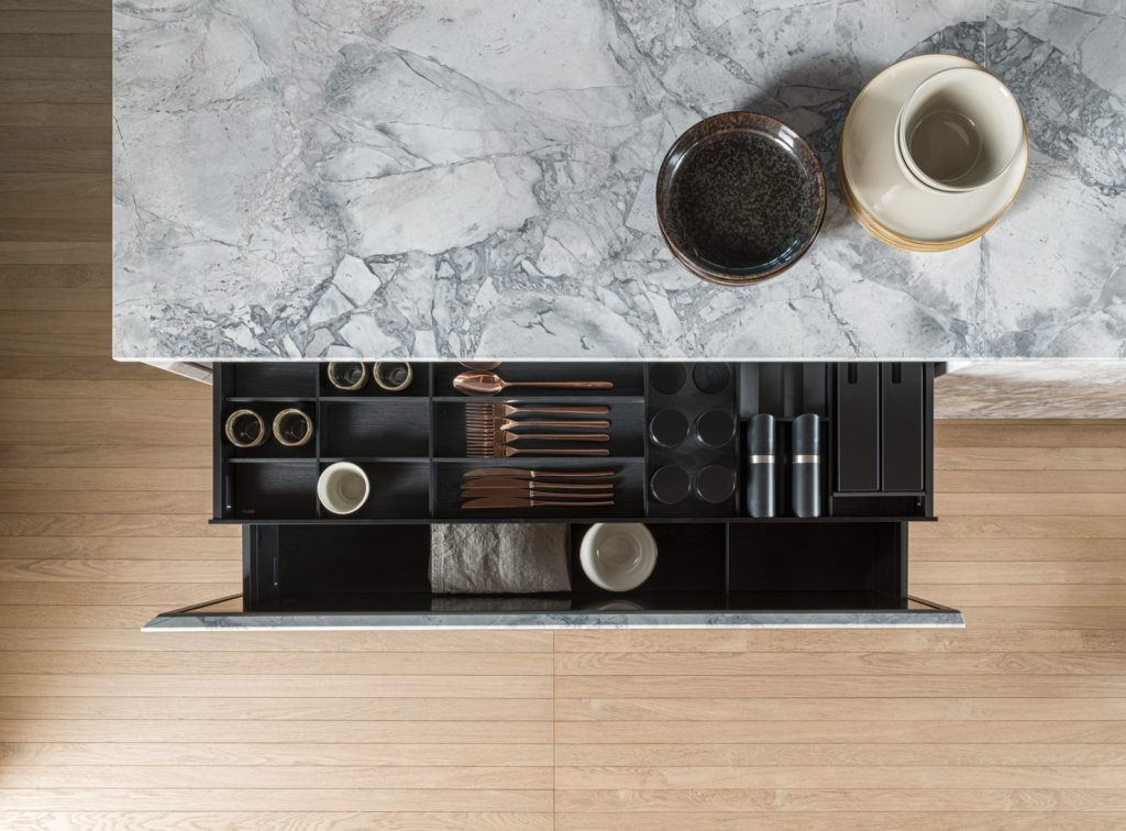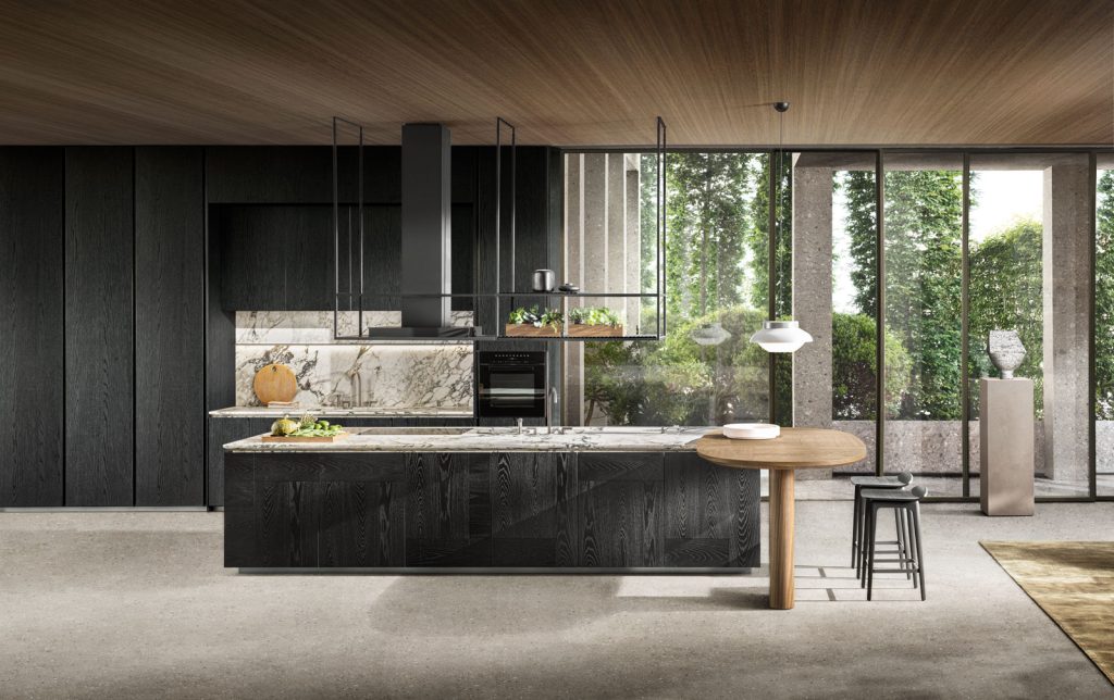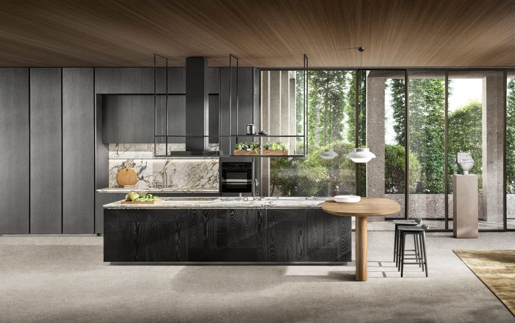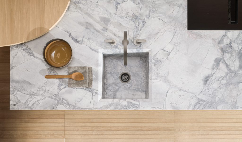 The Intersection kitchen, designed by Vincent van Duysen, draws inspiration from the concept of a monolithic object, using natural stone to create a unique, sculptural, and architectural piece. This design is distinguished by its careful selection of materials and implementation of innovative technologies, ensuring functionality and lightness. The cabinet doors open effortlessly, while the lightweight and durable stone sheets are integrated into an alveolar aluminum structure for greater stability. The kitchen also features geometric inlays and surfaces that play with light and shadow, adding elegance. This creation reflects the deep relationship between interior design and architecture that characterizes Van Duysen’s work, who has redefined the concept of mono-material by applying it not only to countertops but also to doors and side panels.