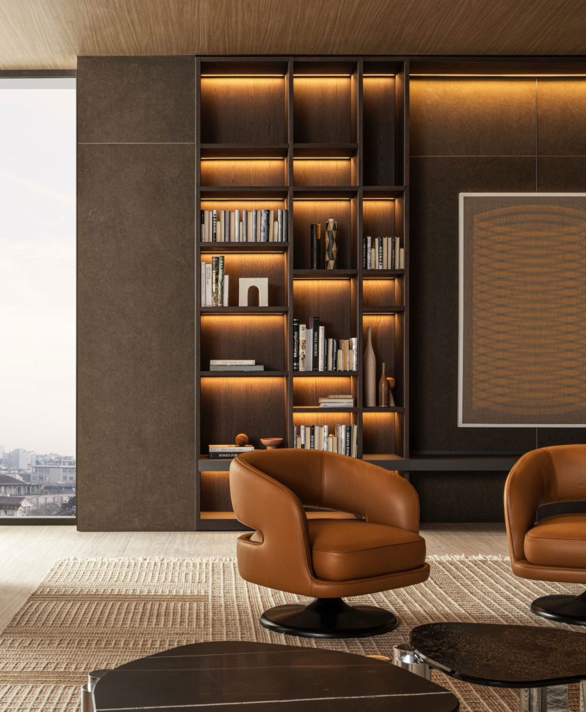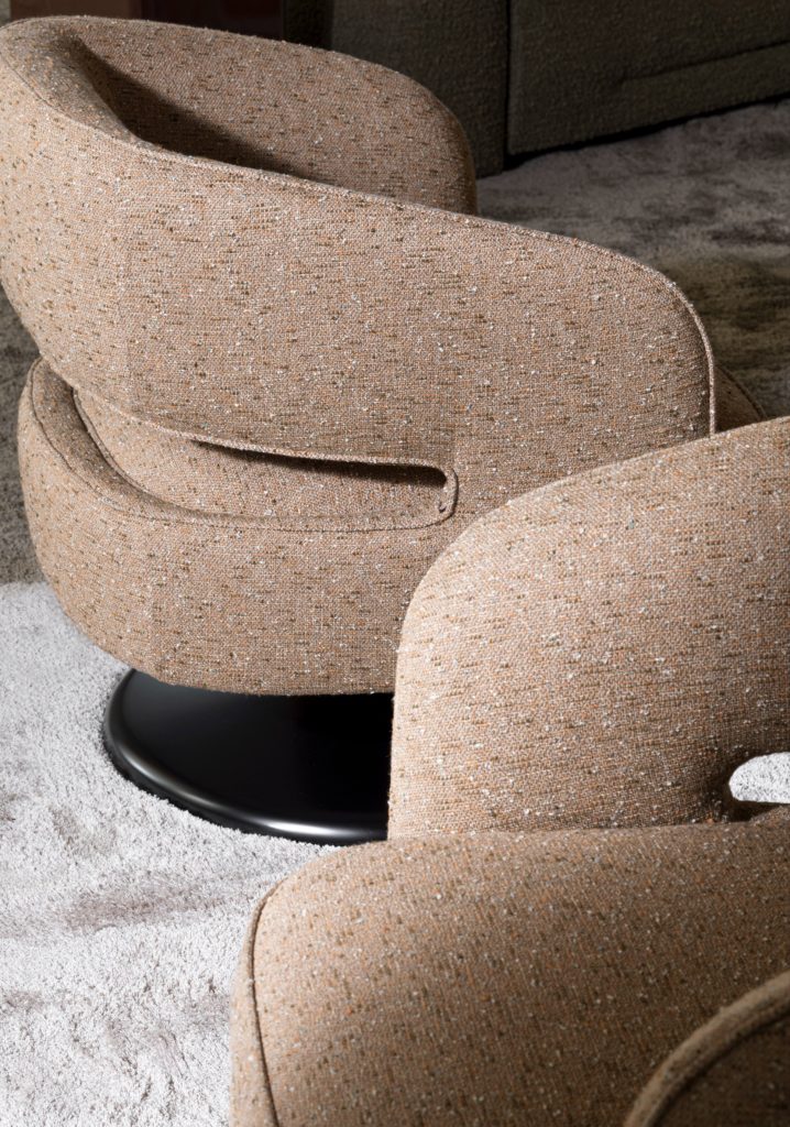The Linea armchair, designed by Vincent Van Duysen, combines tradition and modernity in a piece that reflects the sophisticated aesthetic of the Molteni Collection. Its trumpet-shaped swivel base, inspired by mid-century design, is reinterpreted with contemporary fluidity. A distinctive void in the backrest softens its silhouette and accentuates its sculptural character, while maintaining enveloping comfort. Manufactured with a pine wood and Polimex structure, padded with high-density foam, it offers a balance between support and softness. Upholstered in fabrics or leathers from the collection, Linea brings versatility and timeless elegance to residential or hospitality spaces.