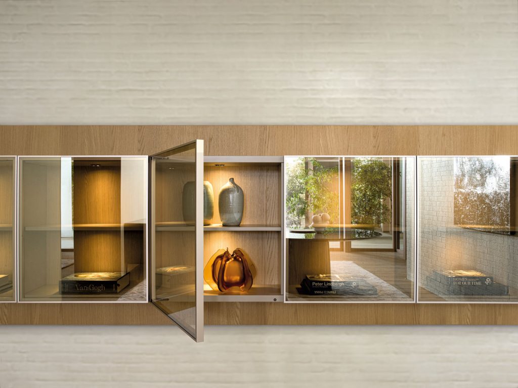 The Password Evolution system is enriched with GRID UP, an elegant wall unit designed by Vincent Van Duysen. This module, which can be open or closed, stands out for its extra-clear glass doors and panels with transparent Stopsol, featuring pewter or iris profiles that enhance its design. Equipped with an innovative system of directional spotlights inside, it offers suitable and sophisticated lighting. Available finishes include a range of matte lacquers, eucalyptus, and different oak tones such as dawn, graphite, and coffee. By fixing directly to the wall, GRID UP creates a surprising dynamic effect, merging architectural essence with contemporary furniture functionality.
