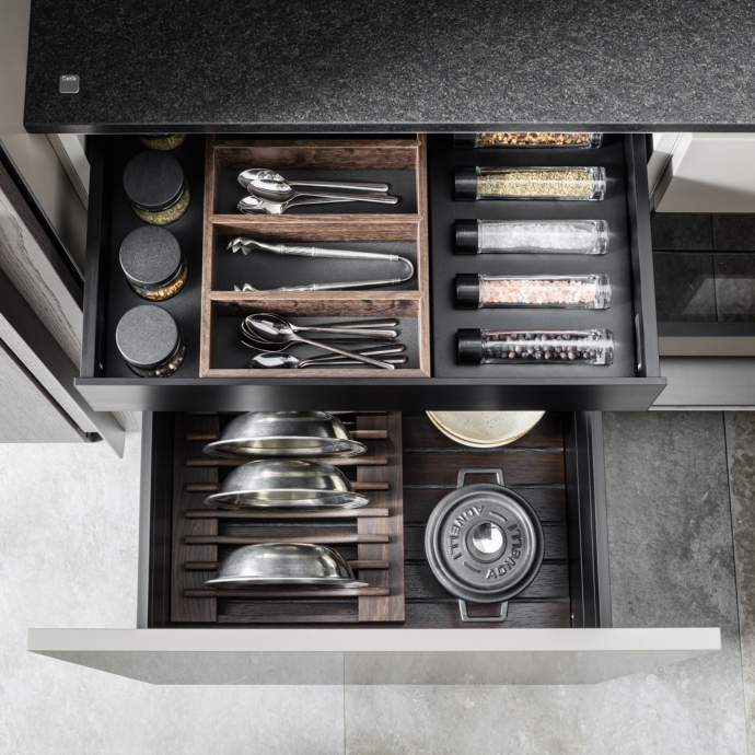 Molteni’s modular smoked oak accessories offer an elegant and functional solution for drawer organization. They include cutlery dividers, glass spice racks, and black steel elements such as boxes and roll holders. Additionally, they feature serving trays, wooden knife holders, and bread cutters. The pot holders have non-slip bottoms, wooden frames, and adjustable supports. They stand out for the possibility of integrating LED lighting in drawers and pot holders, further elevating their sophistication. This innovative approach, driven by Molteni’s Research and Development department, reflects the brand’s commitment to excellence in design and craftsmanship.