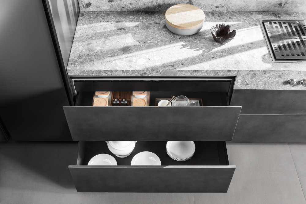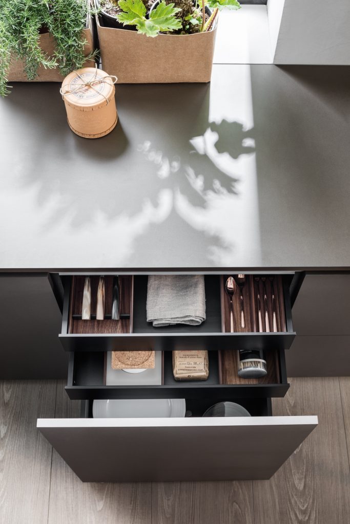 Modular walnut wood accessories for drawer space optimization, including trays, dividers, cutlery grids, cup holders, and knife holders. These compositions adapt to all drawer dimensions, allowing for efficient and elegant organization. Additionally, there’s the option to incorporate integrated LED lighting, providing a modern and functional touch to the furniture layout. Molteni’s Research and Development department works closely with designers, engineers, and artisans to bring to life proposals from prominent architects, ensuring a high-quality product with exclusive design. To stay informed about Molteni Group news and events, we recommend following their official channels.