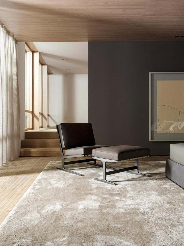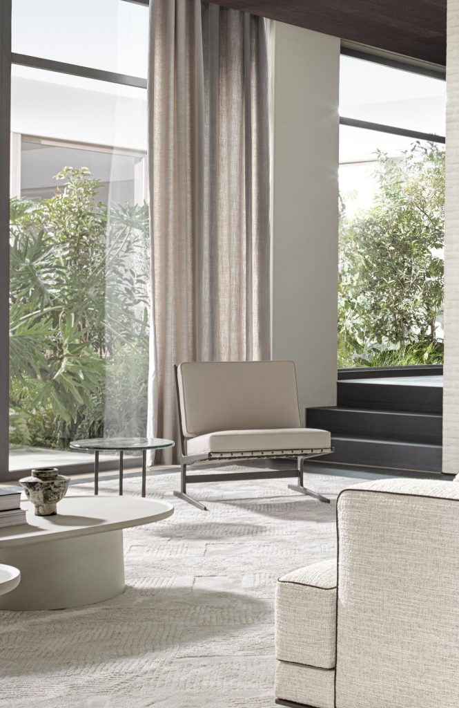 El sillón Paula, diseñado por Vincent Van Duysen, destaca por su innovador diseño que evoca movimiento y ligereza, convirtiéndose en una pieza icónica del mobiliario contemporáneo. Su atemporalidad se basa en proporciones meticulosamente estudiadas, con una estructura basculante y cojines suspendidos que equilibran comodidad y robustez. La forma del sillón se define por un singular sistema de correas de cuero en espiral que ancla el asiento y el respaldo a su sólida estructura metálica, disponible en acabados mate fumé o arena. Los cojines, en cuero de tonalidades naturales, tabaco, avellana o verde barro, añaden un cálido contraste. La otomana a juego complementa el sillón, compartiendo los mismos detalles de diseño y acabados. Paula es una obra maestra que fusiona elegancia contemporánea con un lujoso confort.