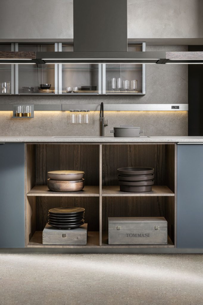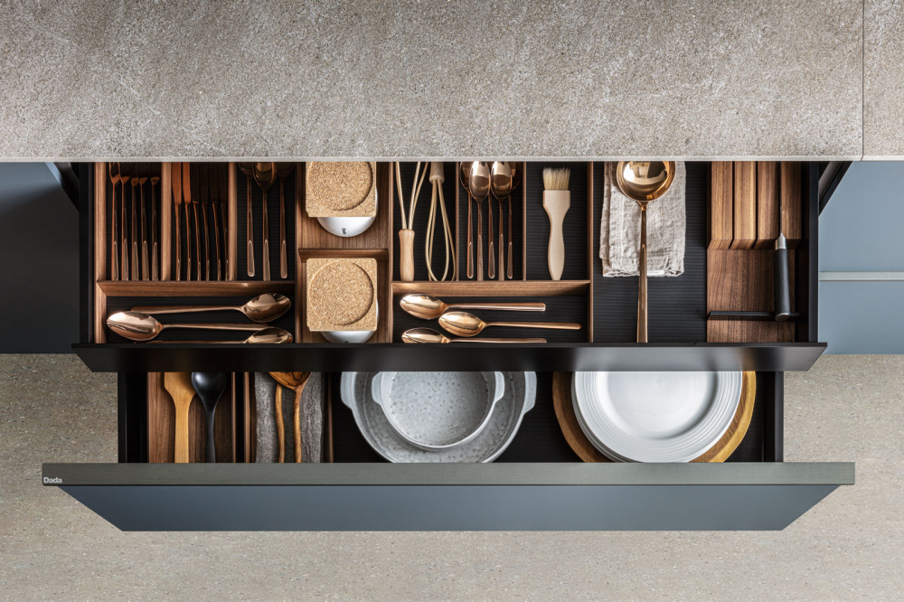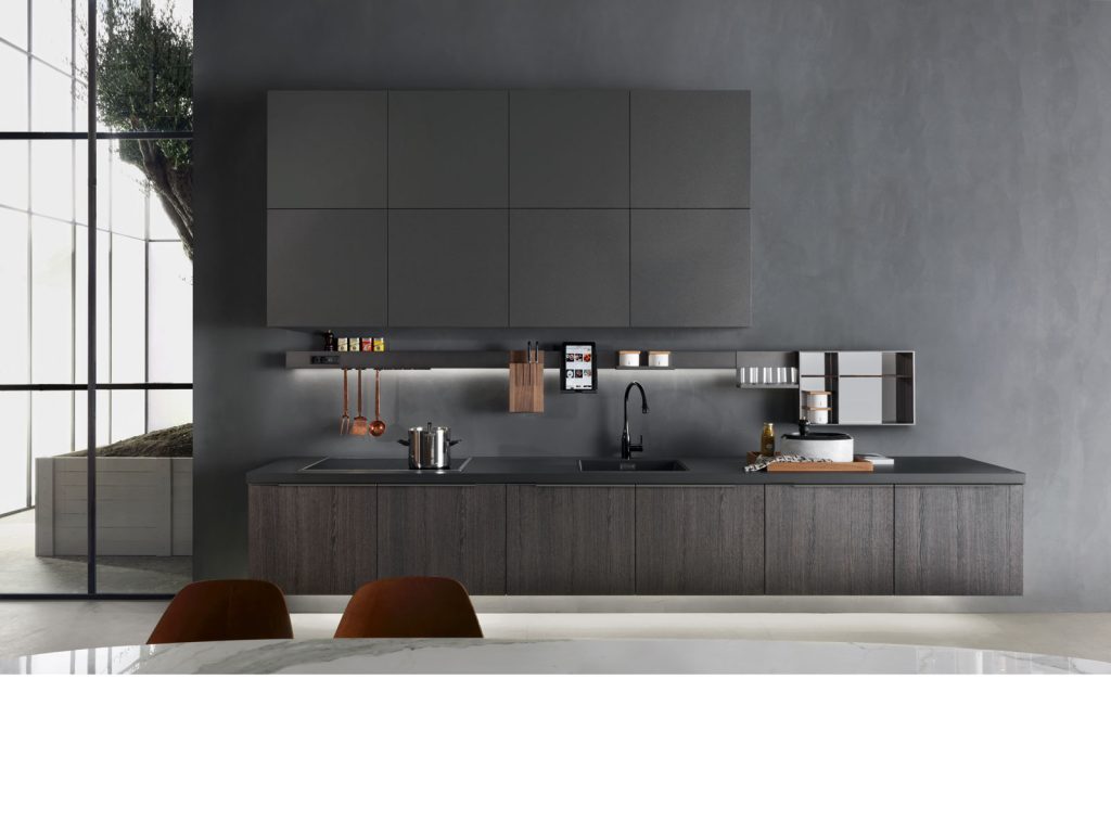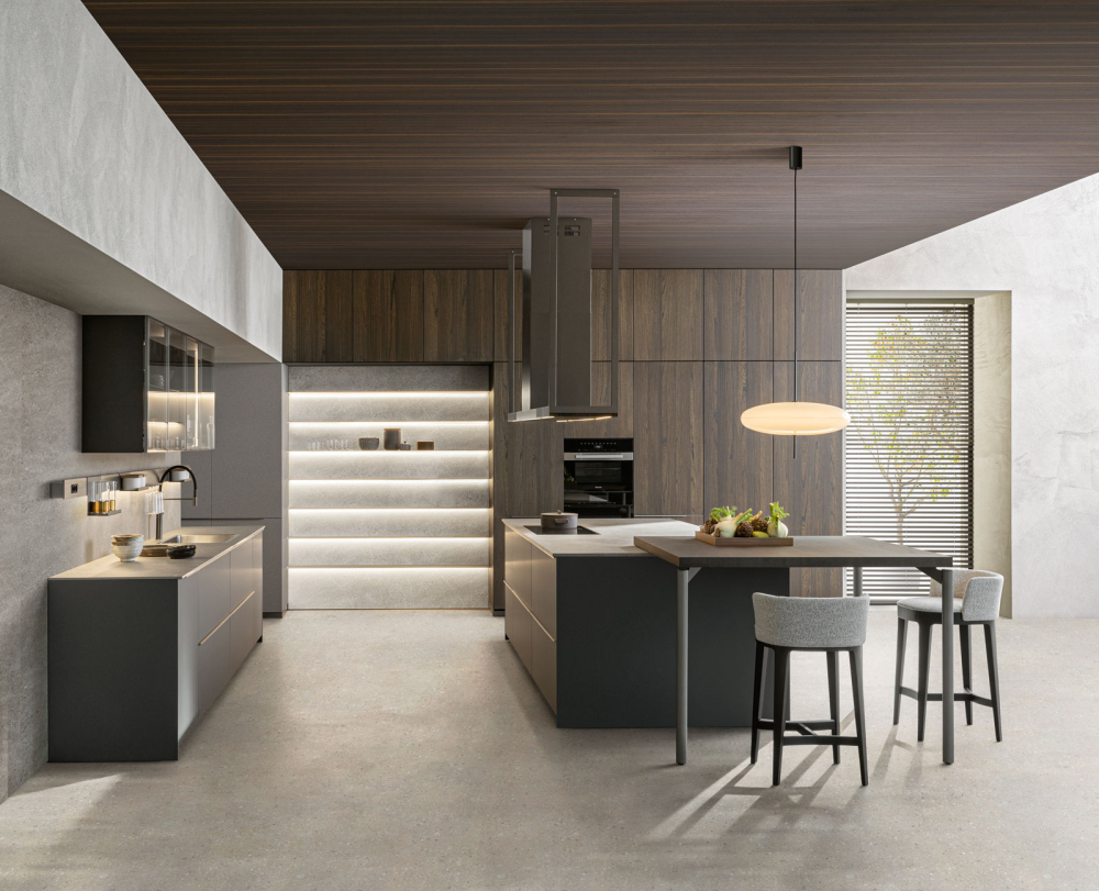La renovada línea INDada presenta un diseño moderno y sofisticado, incorporando nuevos acabados y materiales en colaboración con Molteni&C. Destaca la barra de iluminación 015, un elemento innovador que multiplica las posibilidades de personalización en la cocina. Con un acabado en peltro, esta barra se sitúa entre la superficie de trabajo y los armarios superiores, ofreciendo un soporte práctico para dispositivos tecnológicos y se complementa con los elegantes contenedores colgados Momento. Nicola Gallizia, destacado diseñador y director artístico de Molteni&C desde 2003, ha sido fundamental en el desarrollo de estos productos, enfatizando un estilo único y a medida que fusiona formas, materiales y colores en composiciones personalizadas.