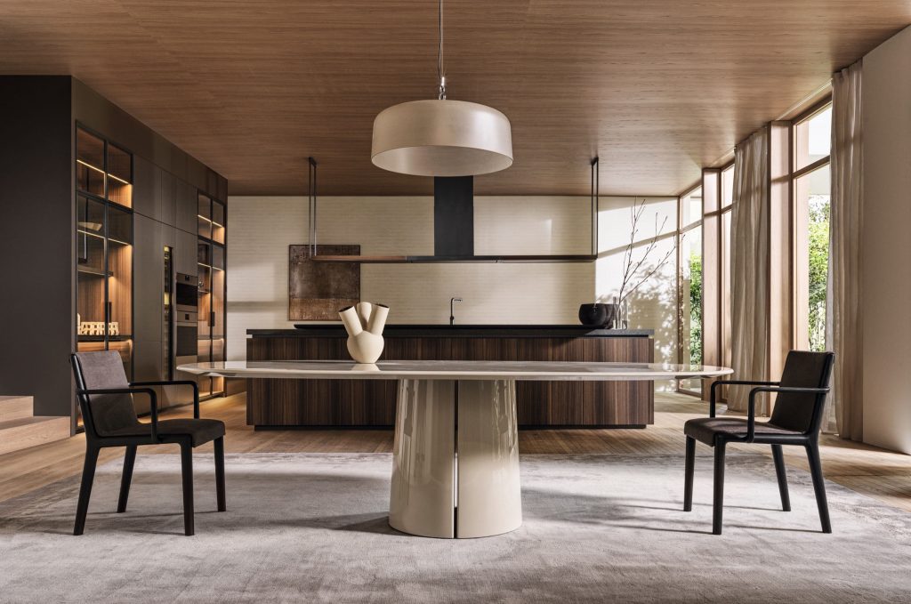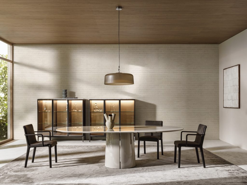 La mesa Mateo de Vincent Van Duysen, diseñada para 2024, presenta un pedestal central cilíndrico y cónico con un acabado acanalado en la base. Disponibles en tamaños de 300, 350 y 400 cm, la mesa ofrece versiones ovaladas y circulares, adaptándose a diversos interiores. Su base curvada y suavemente abocinada proporciona estabilidad y un elemento sorpresa. Los acabados incluyen roble café, roble amanecer, lacado brillante y acero espejado, además de una nueva opción en madera de roble que aporta calidez y durabilidad. La mesa Mateo es una creación atemporal, perfecta para ser el núcleo de tradiciones familiares, destacando la filosofía arquitectónica de Van Duysen en su diseño.