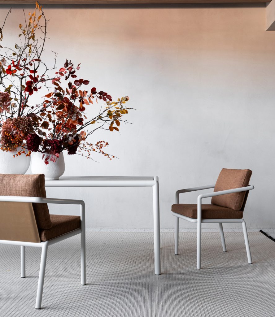 La silla Soleva, diseñada por Vincent Van Duysen, combina proporciones cuidadas, elegancia atemporal y claridad arquitectónica para enriquecer los espacios exteriores. Su estructura tubular de aluminio con recubrimiento en polvo aporta ligereza, resistencia y una integración natural en terrazas y comedores al aire libre. El respaldo, formado por listones verticales de contrachapado marino reciclado con acabado en EVA, suma calidez, textura y un carácter artesanal. Los cojines, hidrófugos y 100 % reciclables, ofrecen un equilibrio ideal entre suavidad y soporte. Además, su diseño apilable une practicidad y sofisticación, convirtiéndola en una opción versátil y funcional para entornos residenciales y de hostelería.